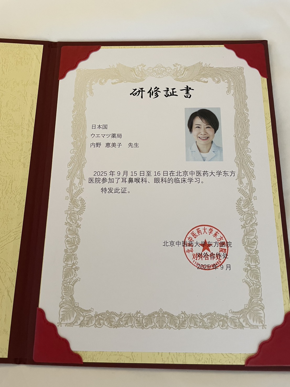 この度、9月13日から9月17日にかけて、ウエマツ薬局の内野恵美子が北京中医学大学東方病院に研修に行ってきました。