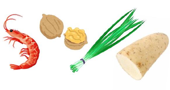 穴子、海老、山芋、くるみ、ごま、にら、にんにく