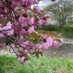 写真は先月に近くの川沿いで満開になっていた八重桜です。