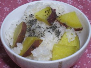 2、さつまいもを厚さ1cm、幅1~2cm程に切って、①に加え、炊く。