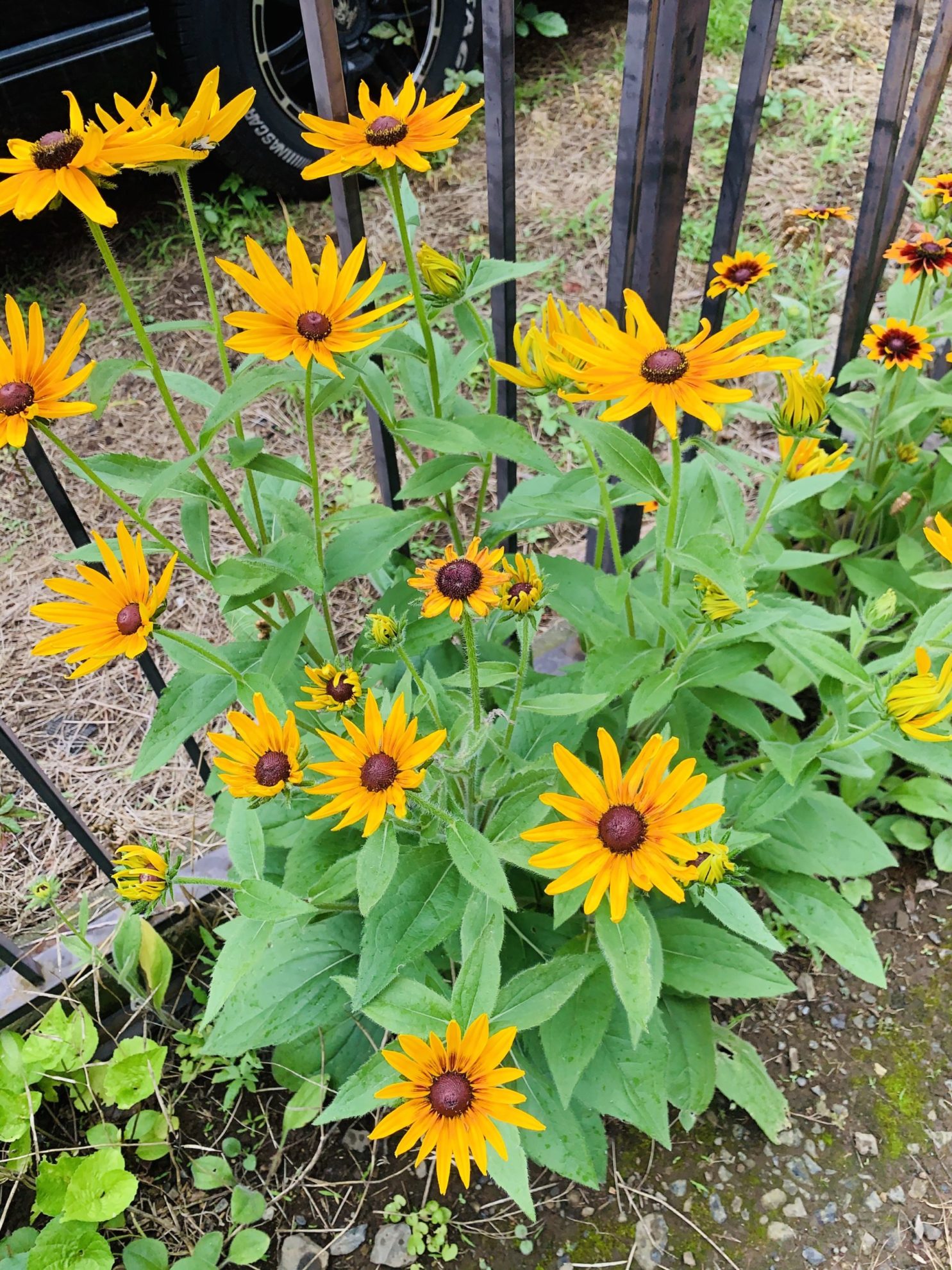 今6時。小雨の中、誰も歩いていない住宅街をよそのお宅の花を見ながら歩いています。