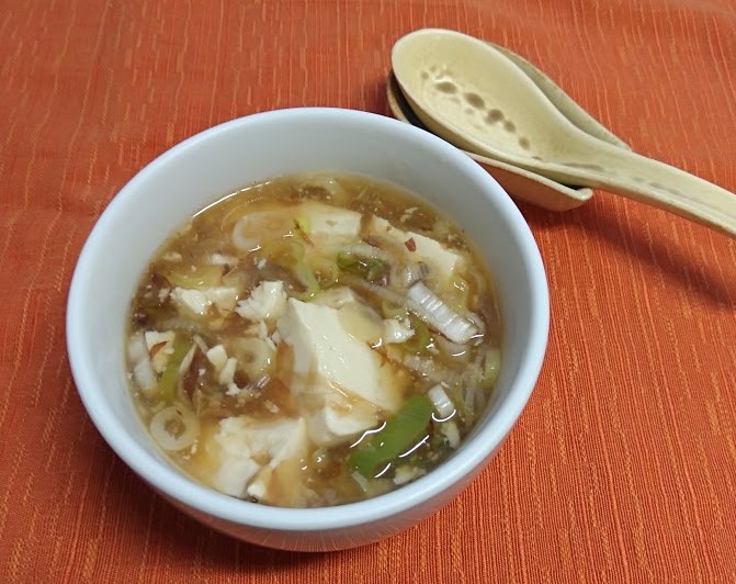 今日は、ネギと豆腐のスープに、片栗粉でとろみをつけ、