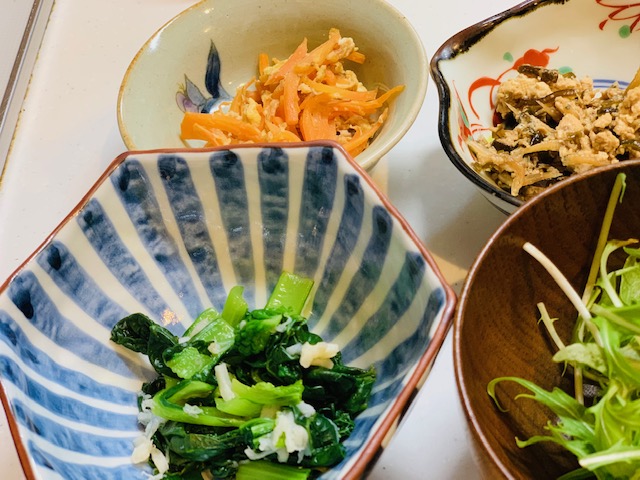 小松菜をさっと茹でて、ポン酢をかけて、ツナの缶詰を少し混ぜました。