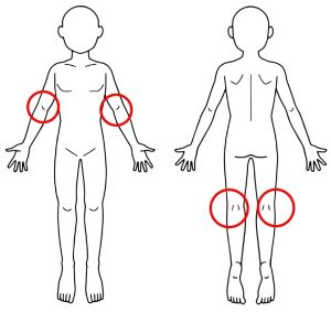 痒みを伴う発疹が繰り返し出現。発疹は顔や首、肘や膝の窪みに現れやすく、ひどくなると全身に広がることもあります。
