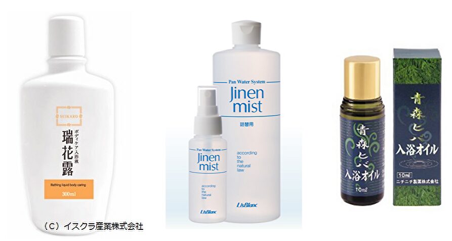 花しずく潤(ルン)乳液・瑞花露(すいかろ)入浴剤・瑞花露ローション・青森ヒバオイルなど。