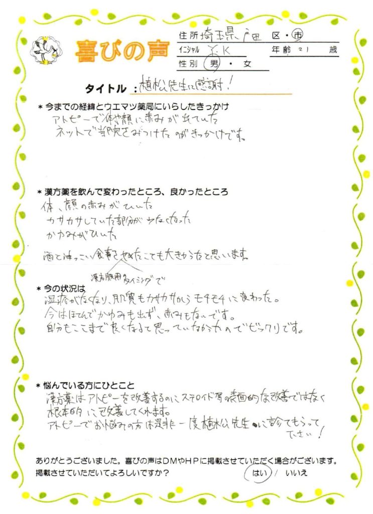 漢方薬を飲み始めて10か月でこの喜びの声を書いて下さるほど
