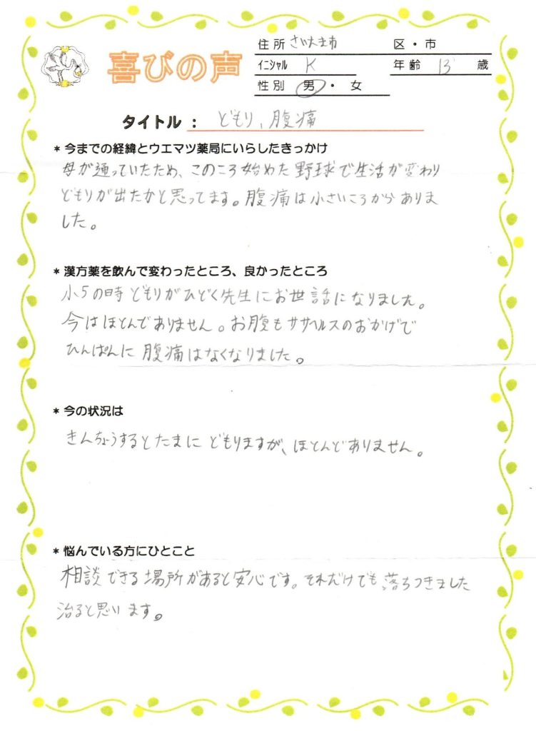 この「喜びの声」を書いてくだった少年は、自分の努力や母親はじめ周囲の愛情でいつの間にか治ってきました。