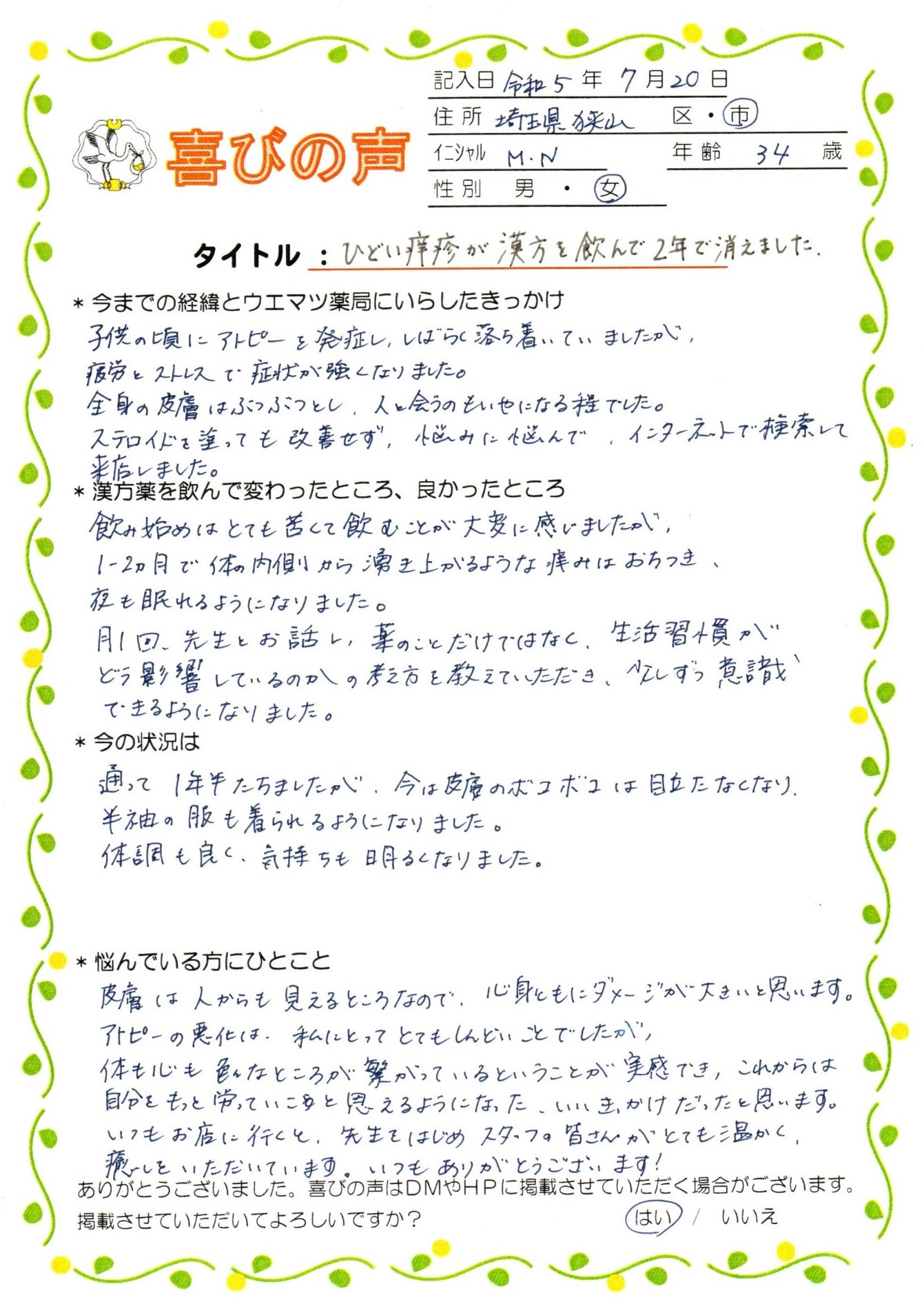 そのあいだにご本人が少しずつ生活習慣や食事を改善されていったので、頑固な痒疹も早く改善されたのでしょう。