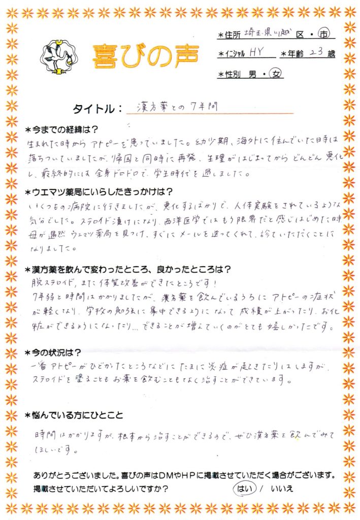 7年弱と時間はかかりましたが、漢方薬を飲んでいるうちに、アトピーの症状が軽くなり、学校の勉強に集中できるようになって、成績が上がったり、お化粧ができるようになったり・・・できる事が増えていくのがとても嬉しかったです。
