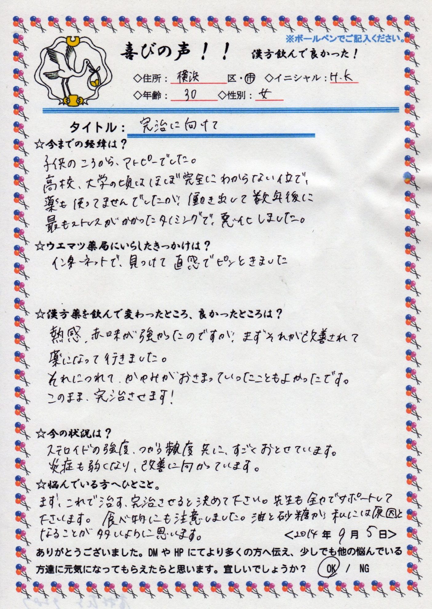 毎日ステロイド軟こうを使い、ツムラのエキス剤を3種類2年以上飲んでいましたが、これ以上よくならない、と来店されました。