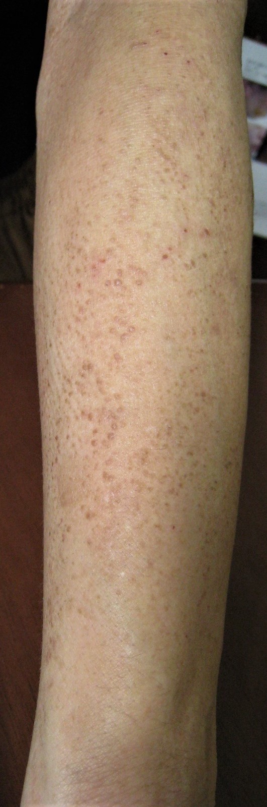 アミロイド苔癬が腕と手に出て、皮膚科医からは「一生治らない」と言われていたようです。