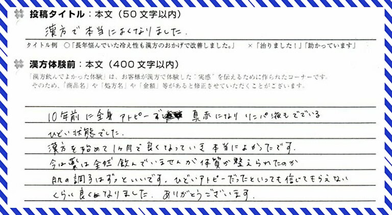 漢方を始めて1ヶ月で良くなっていき本当によかったです。