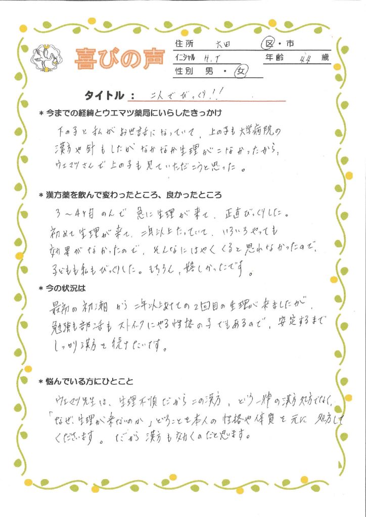 初めて生理が来て、2年以上たっていて、いろいろやっても効果がなかったので、