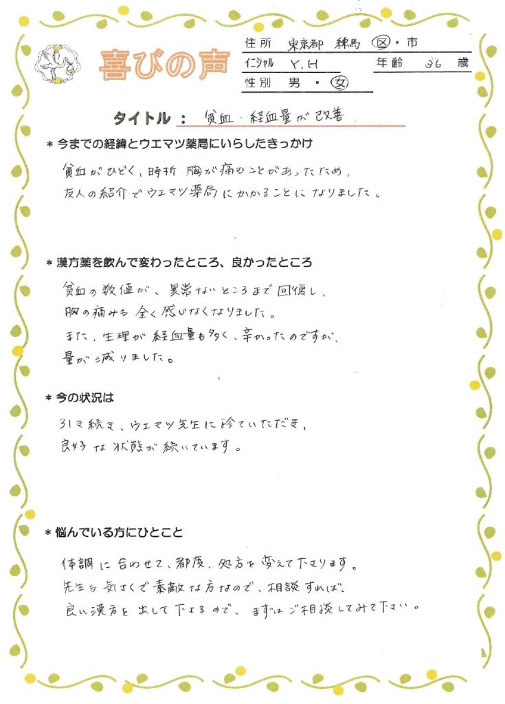 貧血がひどく、時折胸が痛むことがあったため、友人の紹介でウエマツ薬局にかかることになりました。