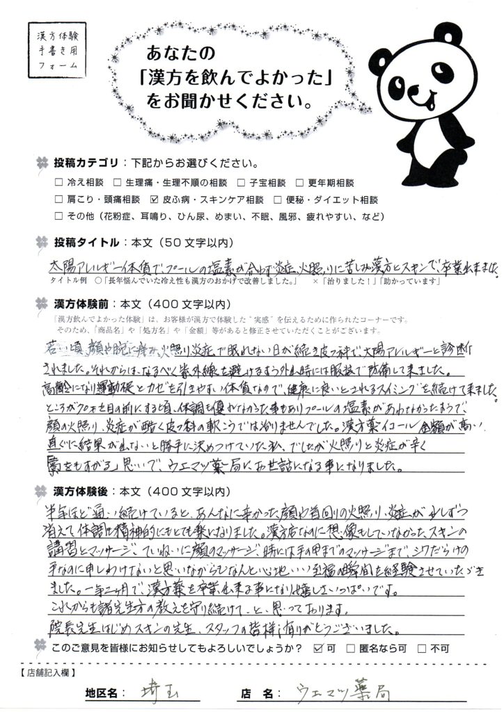 スキンケアもご指導しましたところ、大変気に入られ、漢方薬は終わりにして、スキンケアだけしていきたい、とおっしゃるくらい、肌が丈夫になりました。
