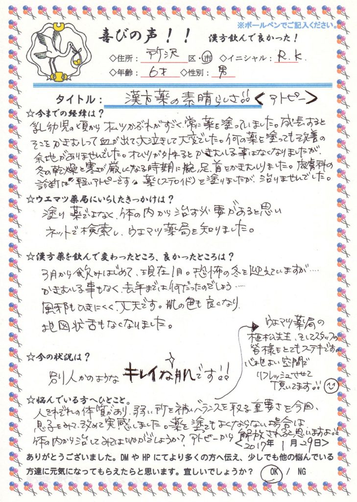 塗り薬ではなく、体の内から治す必要があると思い、ネットで検索し、ウエマツ薬局を知りました。