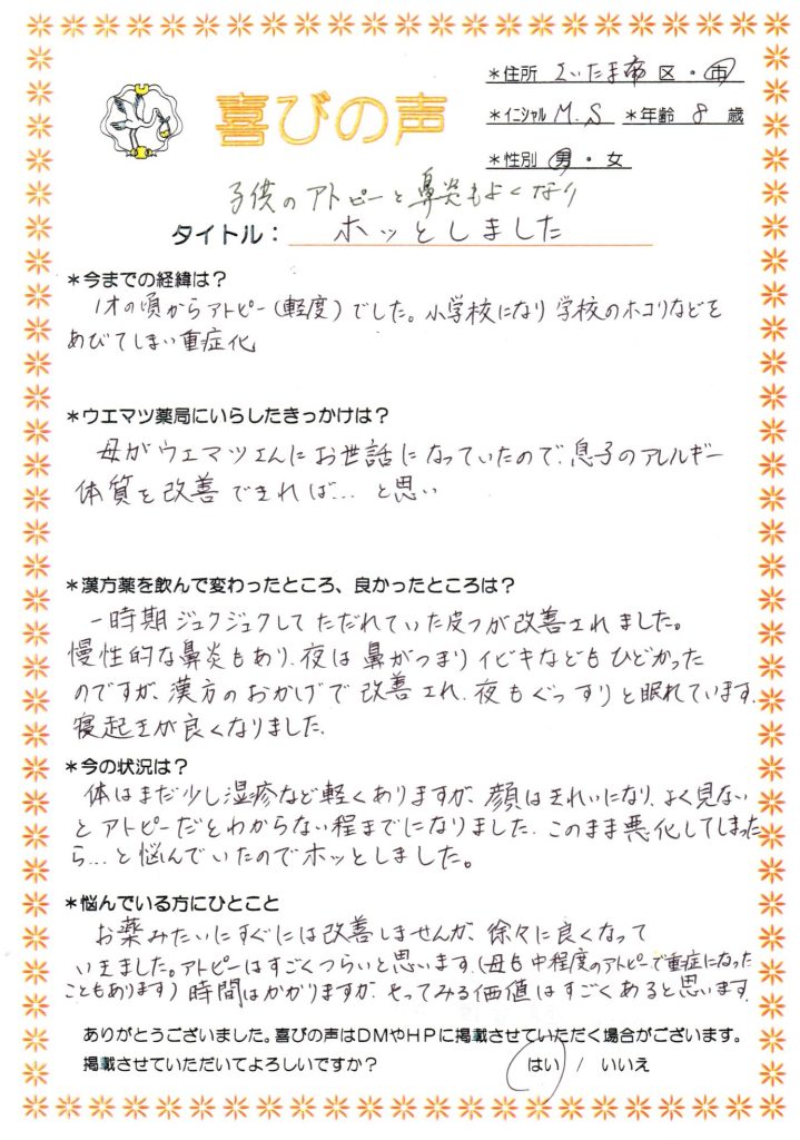 敏感体質なので漢方薬や食事で体質を改善していくと、アトピーだけでなく鼻炎や喘息も良くなっていくので喜ばれています。