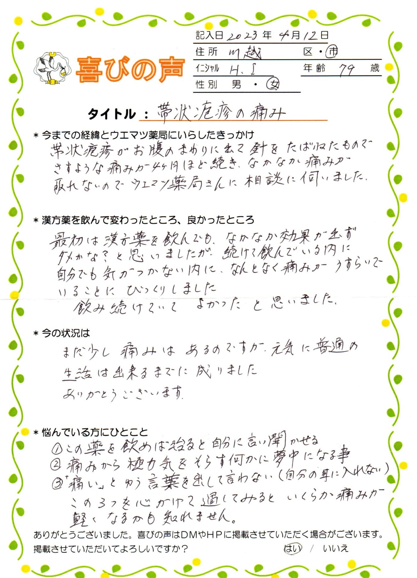 なかなか痛みが取れないので、ウエマツ薬局さんに相談に伺いました。