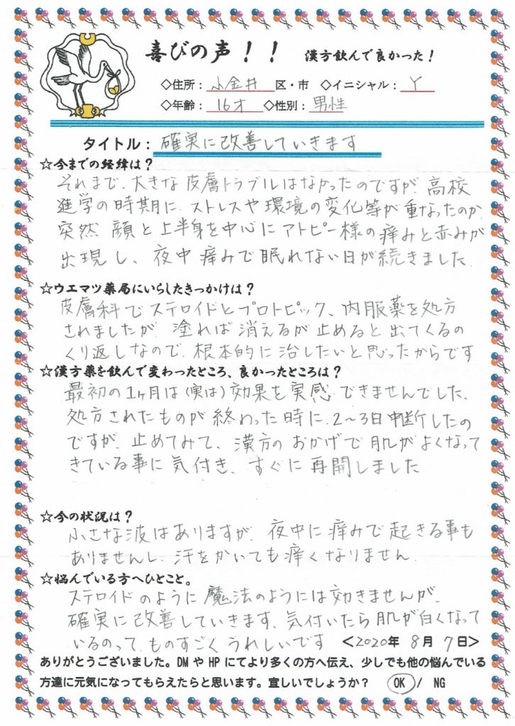 それまで、大きな皮膚トラブルはなかったのですが、高校進学の時期に、ストレスや環境の変化等が重なったのか、突然、顔と上半身を中心にアトピーのような痒みと赤みが出て、夜中、痒みで眠れない日が続きました。