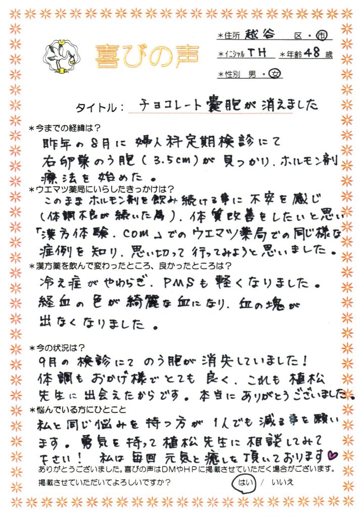 毎日楽しく過ごすよう、ご指導しましたら、なんとチョコレート嚢胞が消えて、本人もドクターも驚かれたようです。