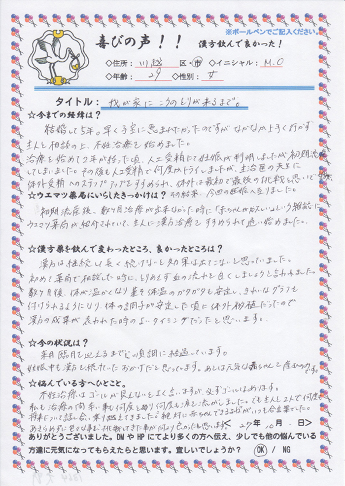 初期流産後、数ヶ月治療が出来なかった時に、「赤ちゃんが欲しい」という雑誌にウエマツ薬局が紹介されていて、主人に漢方治療をすすめられて通い始めました。