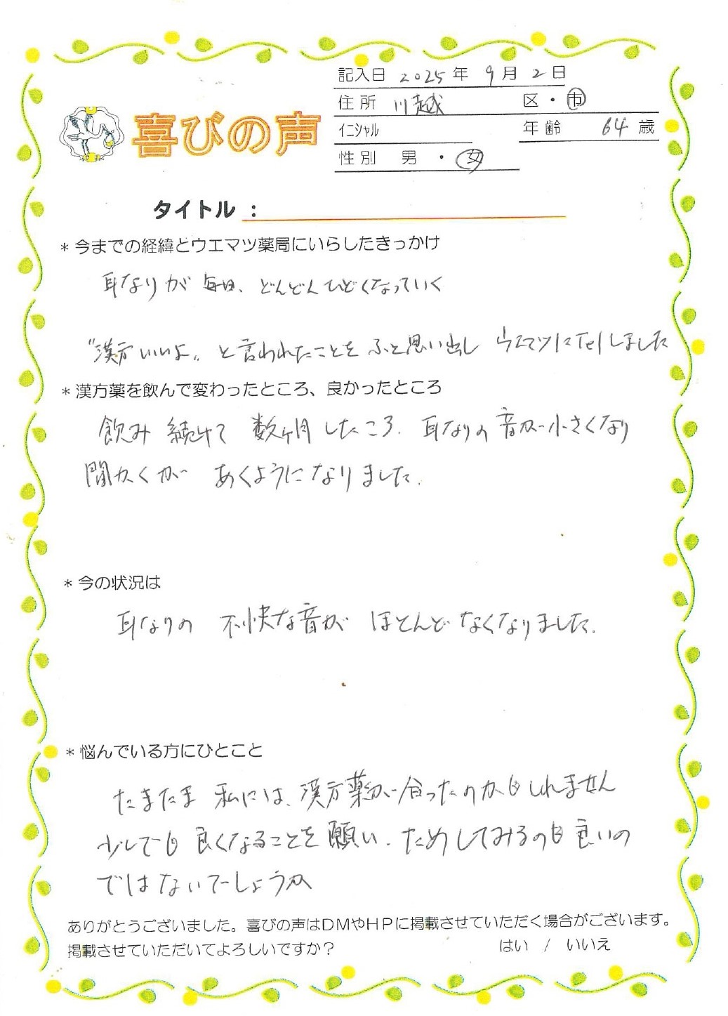 飲み続けて数ヶ月したころ、耳鳴りの音が小さくなり、間隔があくようになりました。