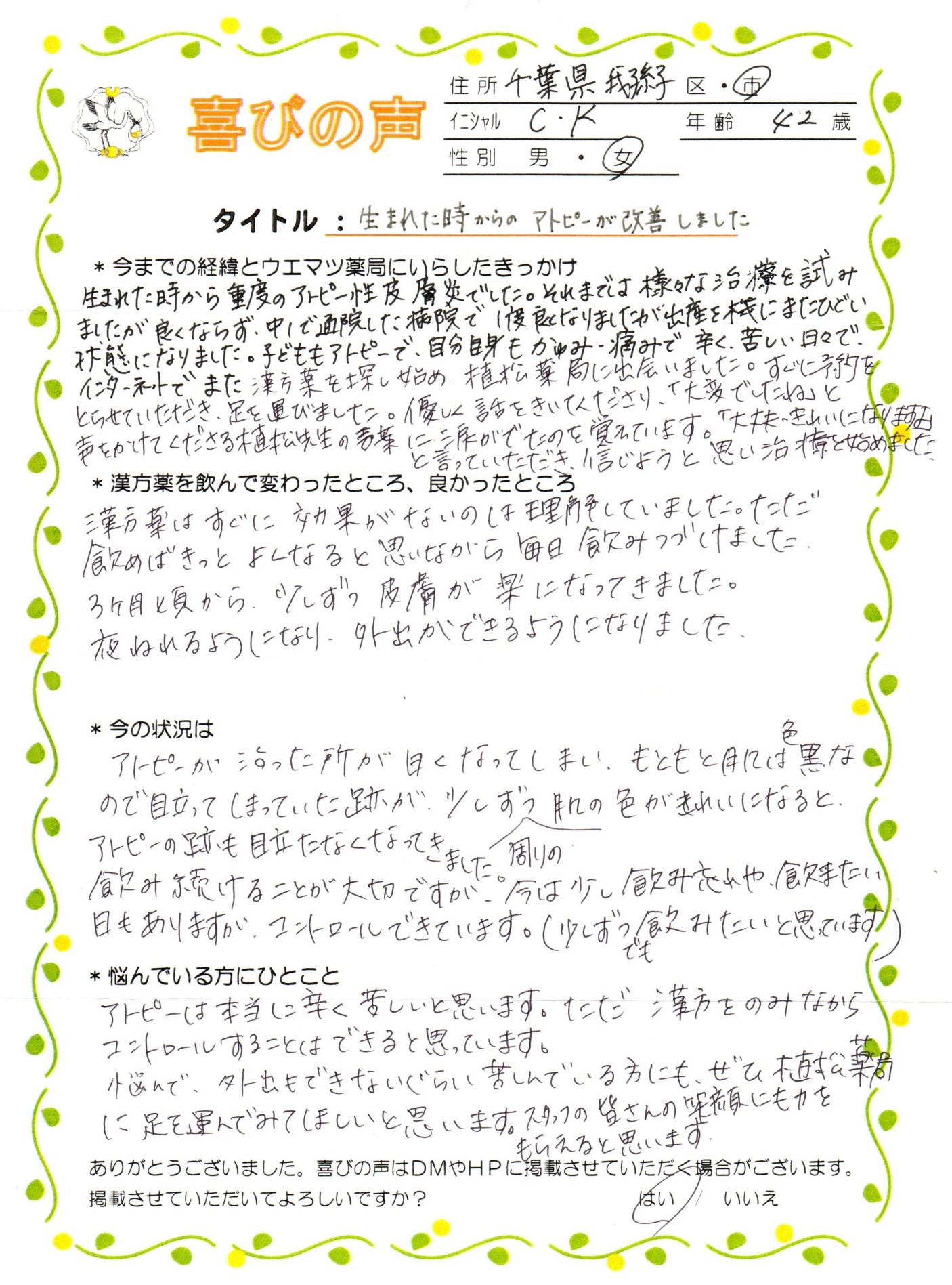 子どもの時から重度のアトピーでした。いったん軽快しましたが、出産を機にまた再発しました。