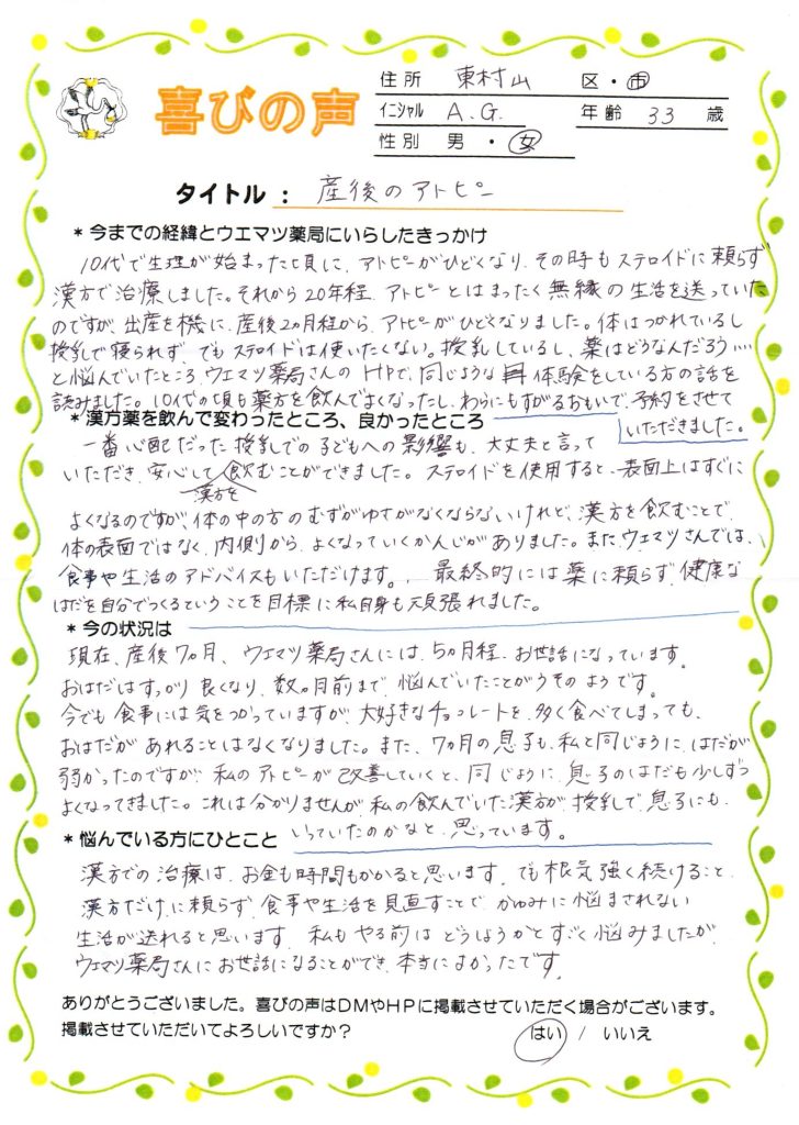 ステロイドを使用すると、表面上はすぐに良くなるのですが、体の中の方のむず痒さがなくならないけれど、漢方を飲むことで、体の表面ではなく、内側から良くなっていく感じがありました。