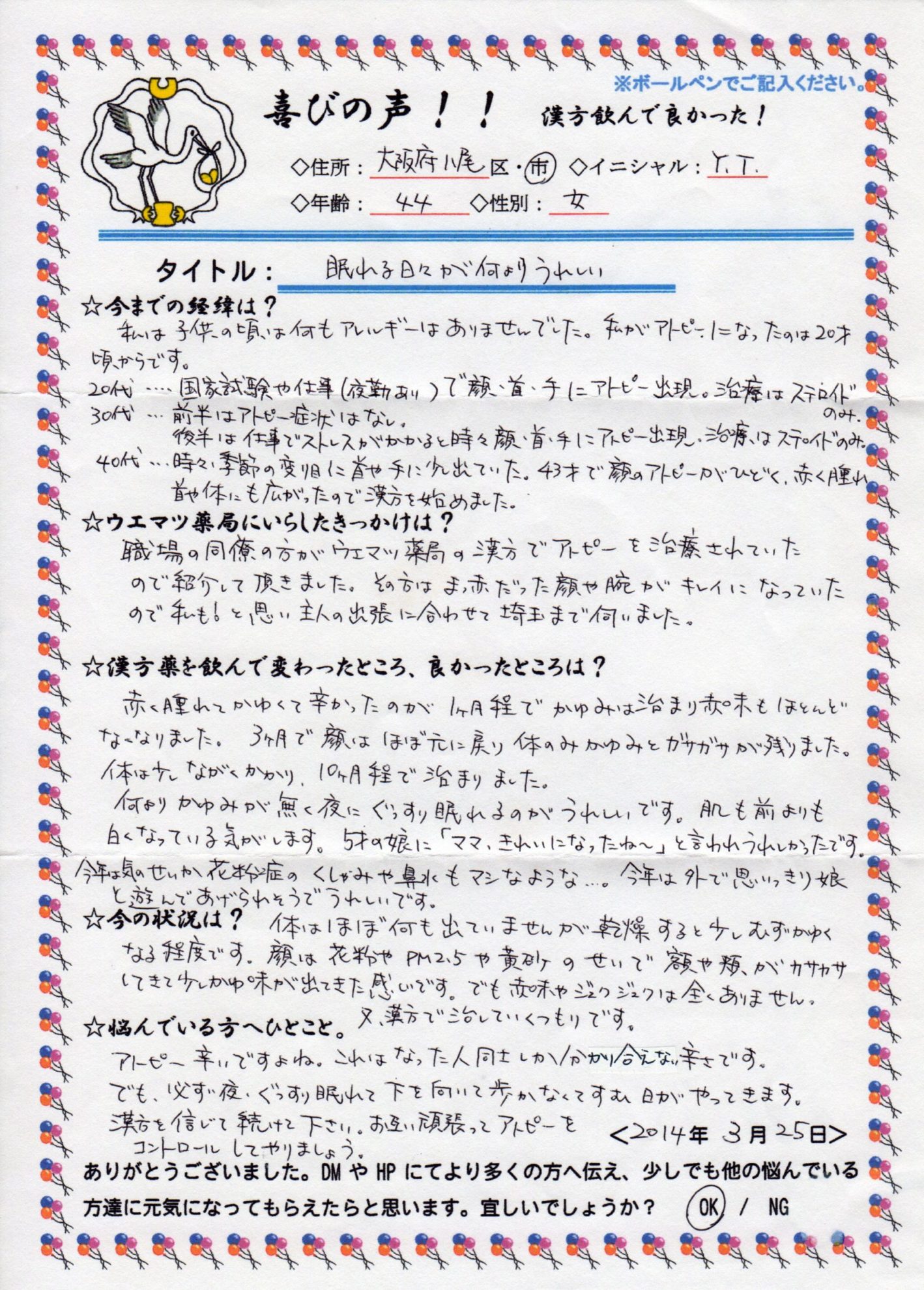 漢方を信じて続けてください。お互い頑張ってアトピーをコントロールしてやりましょう。