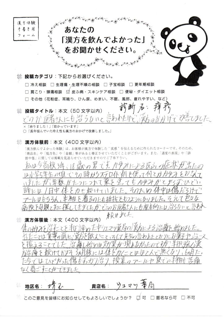 初めは効果が現れなかったのですが、辛抱強く続け、およそ3カ月後には体を掻くことはほとんどなくなり、6ヶ月経った、今では酷かった傷もすっかり治り、授業のプールや夏の半袖も苦痛なく過ごすことが出来ました。