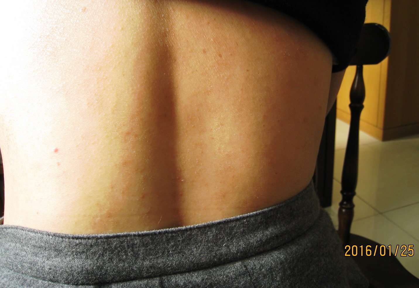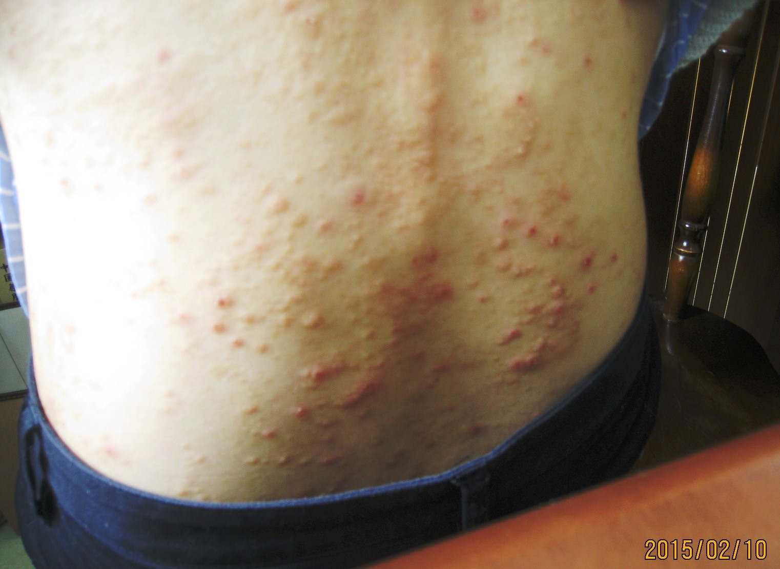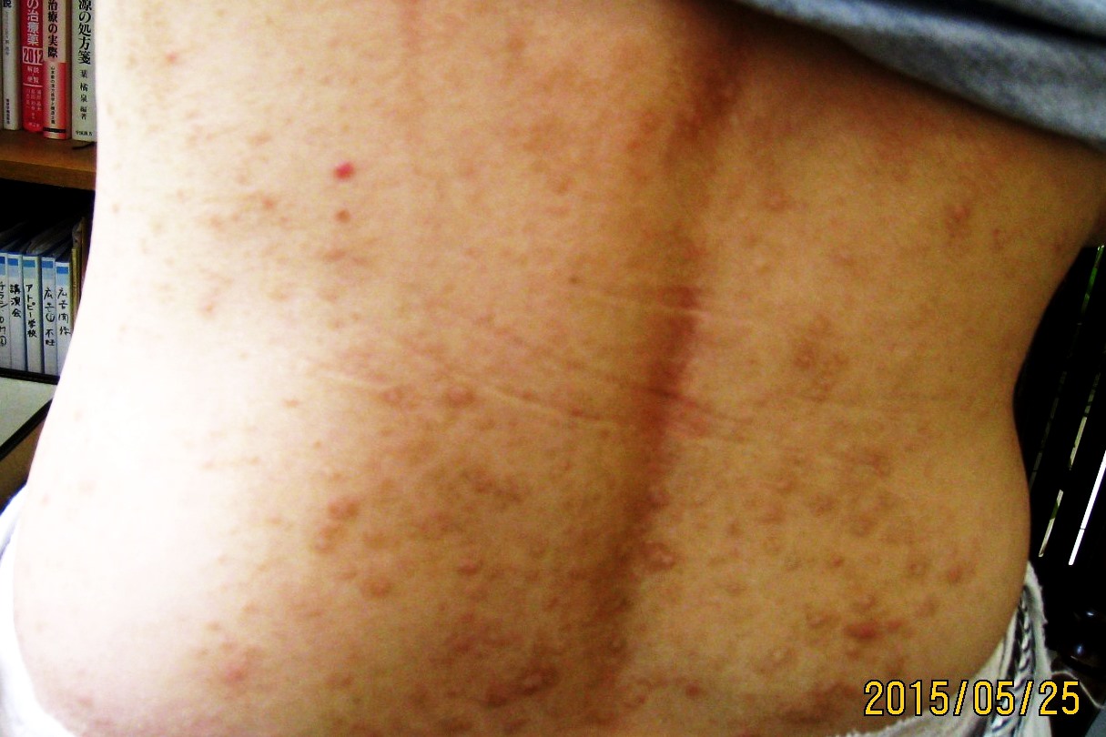 かゆみひどく、かきむしったため痒疹のようなぶつぶつが背中一面できてしまいました。