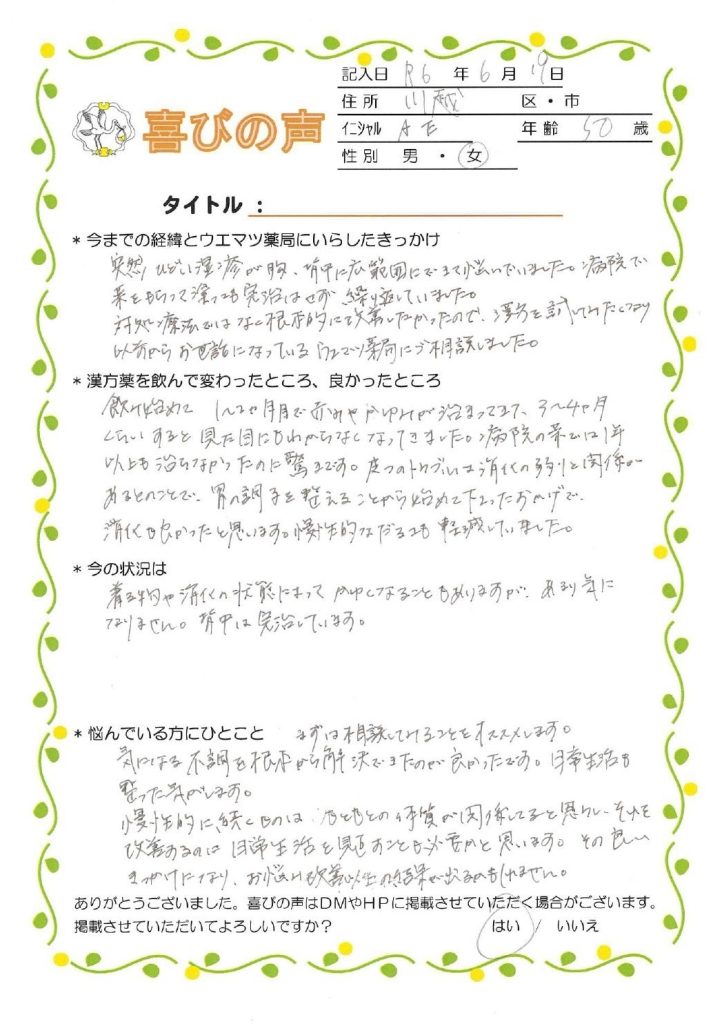 皮ふのトラブルは消化の弱りと関係があるとのことで、胃の調子を整えることから始めて下さったおかげで、消化も良かったと思います。