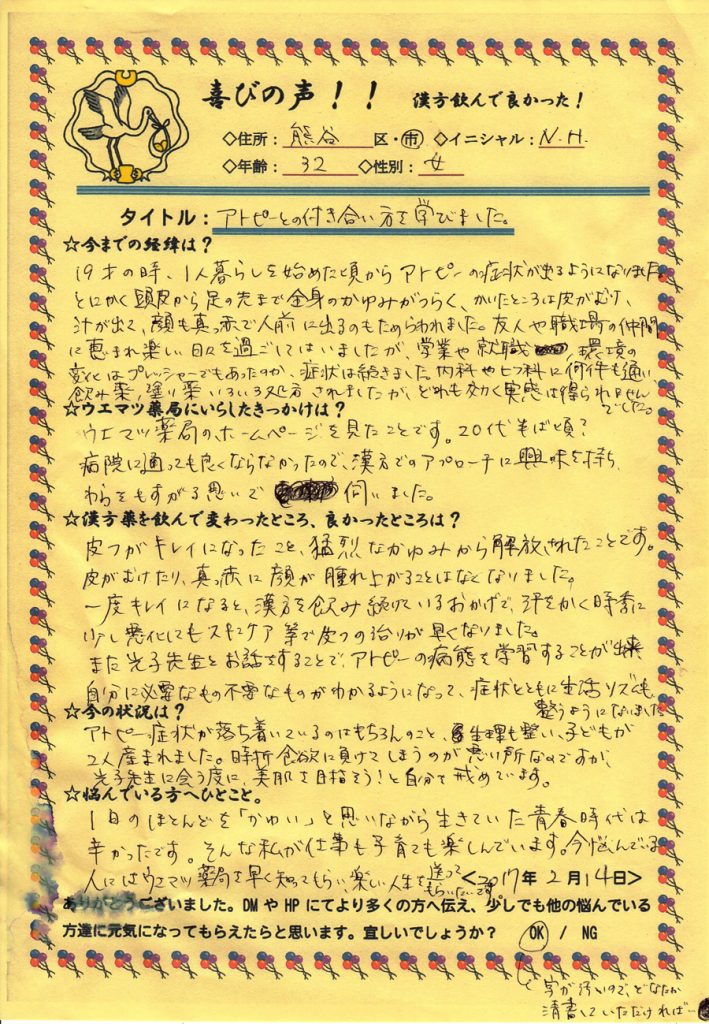 また、光子先生とお話することで、アトピーの病態を学習することが出来、自分に必要なもの、不要なものがわかるようになって、症状とともに生活リズムも整うようになりました。