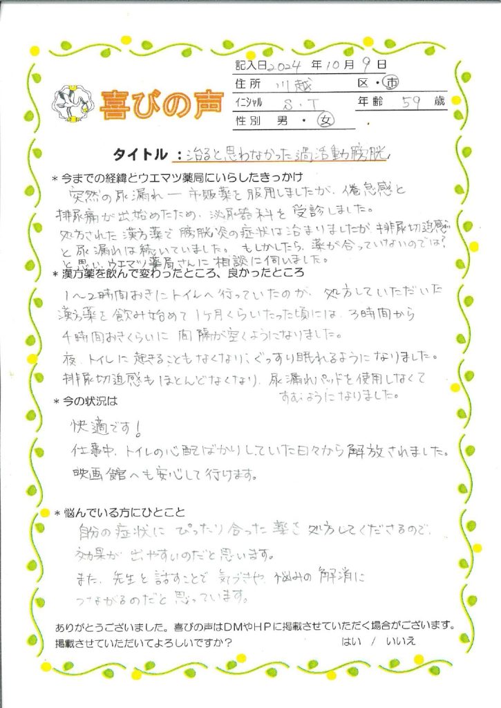 1~2時間おきにトイレへ行っていたのが、処方していただいた漢方薬を飲み始めて