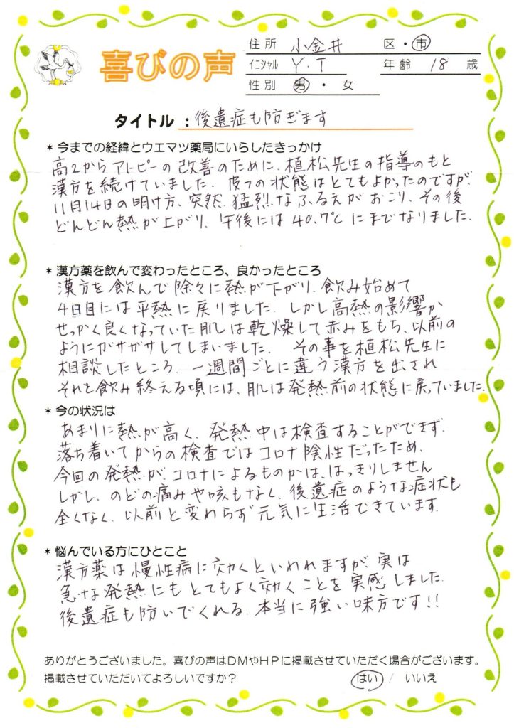 高2からアトピーの改善のために植松先生の指導のもと、漢方を続けていました。