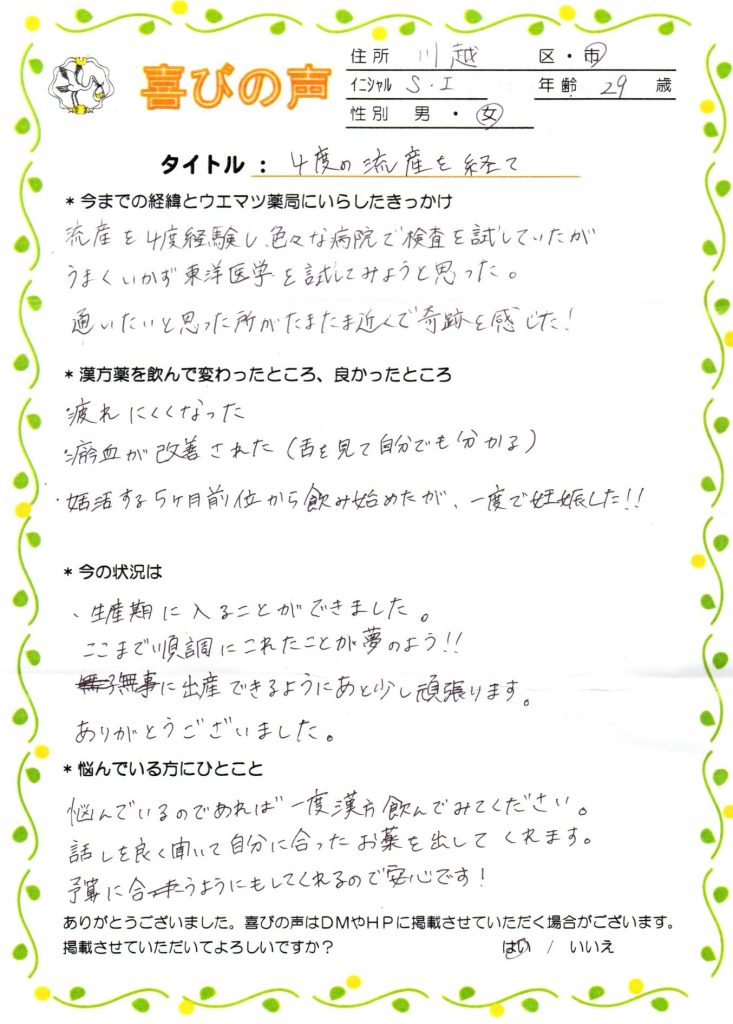 流産を4度経験し、色々な病院で検査を試してみたが、うまくいかず、東洋医学を試してみようと思った。