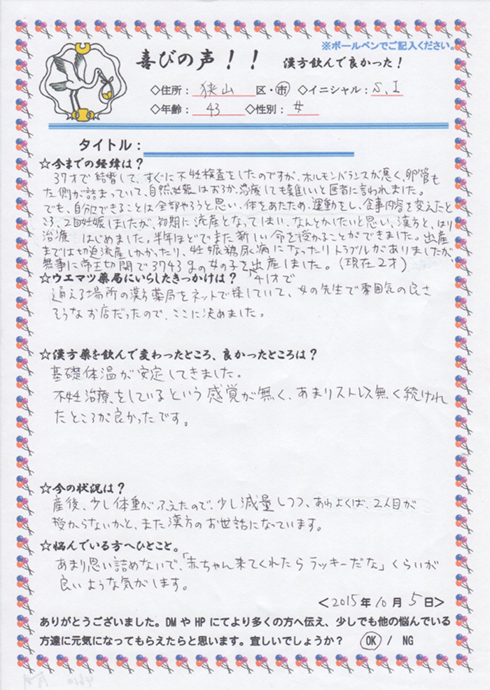 でも自分にできることは全部やろうと思い、体をあたため、運動をし、食事内容を変えたところ、2回妊娠しましたが、初期に流産となってしまい、なんとかしたいと思い、漢方と針治療をはじめました。